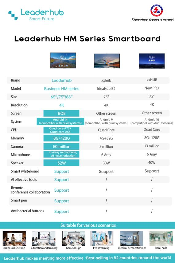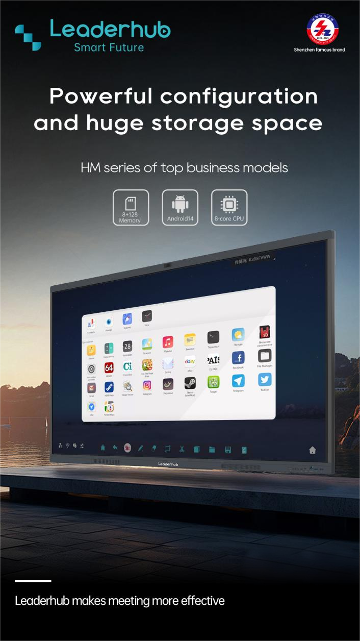 The Leaderhub Business Top Configuration HM series is equipped with an octa-core A72+A53 architecture, combined with 8GB of running memory and 128GB of storage space, which can maintain smooth operation whether running multiple applications or conducting high-definition video conferences. In addition, the product runs the latest Android 14 system. The kernel upgrade makes switching between multiple applications as smooth as flowing water, and the system response is faster, avoiding lags, bringing users an ultra-smooth operation experience. It also supports OPS expansion, allowing users to freely switch between Android and Windows dual systems, flexibly adapting to different meeting scenarios and improving device compatibility.