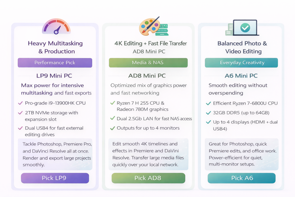 The right choice starts by defining your workload, then matching the CPU, RAM, storage, and ports to those needs.Photoshop, Premiere Pro, and DaVinci Resolve do not stress hardware in exactly the same way, so “any mini PC” is not automatically a good mini PC for creative work. In the next section, we’ll break down the few specs that actually move the needle for editing—then recommend the right Leaderhub model (LP9/AD8/A6) based on workload.